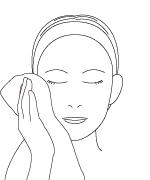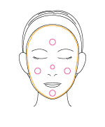 2.両頬、額、鼻、あごの5箇所にのせます。 ※先につけたスキンエッセンスを流さずに上から重ねてつけます。 |