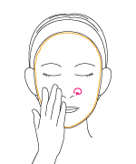 5.ポイントメイクや小鼻のきわなどは、円を描くように馴染ませます。 ※UVケアや毛穴カバーなどをお使いの方は量を多めにご使用ください。 |
